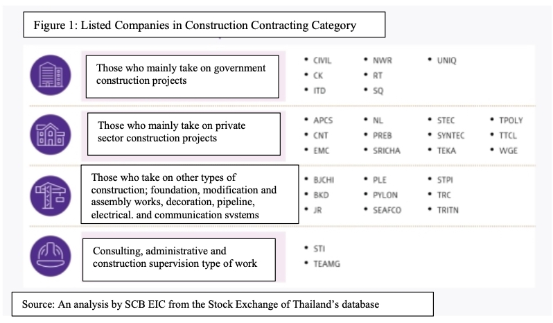 There are several players in the construction industry in Thailand, major contractors who are capable of taking on large-scale structures and complex projects, medium- and small-sized contractors who serve as subcontractors from major ones. They are capable of handling medium- and small-sized projects with less complexity. Construction contractors can be categorized into 4 main groups, namely 1) those who mainly take on government construction projects such as infrastructure 2) those who mainly take on private sector construction projects such as buildings, accommodations and factories 3) those who take on other types of construction such as foundation works, modification and assembly works, decoration, pipeline systems, electrical systems, and communication systems and 4) consulting, administrative and construction supervision type of work.