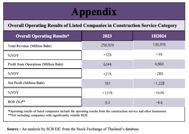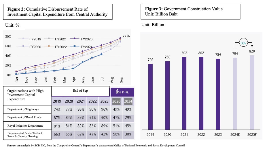 There was a sign of recovery of the government construction in the second half of 2024, and a growth tendency of 3% in 2025. In the first 4 months of 2024, the government construction sector encountered challenges in the form of delayed budgeting. However, the budget announcement in May 2024 resulted in an accelerated disbursement of cumulative capital expenditure. It was expected that the government construction outlook should improve in the second half of 2024, from an expedited disbursement of capital expenditure. In 2025, given that the annual budgeting is completed in time for the enforcement in September 2024 or with only a slight delay and timely disbursement, this will be a supporting factor for the government construction sector in 2025. SCB EIC is of the view that the government construction sector in 2025 is likely to expand by 3% YoY. Moreover, several organizations are planning to initiate a tender of transportation mega projects, presenting opportunities for large contractors and allowing opportunities for mid-scale and small-scale construction operators as subcontractors to generate revenue and improve liquidity.