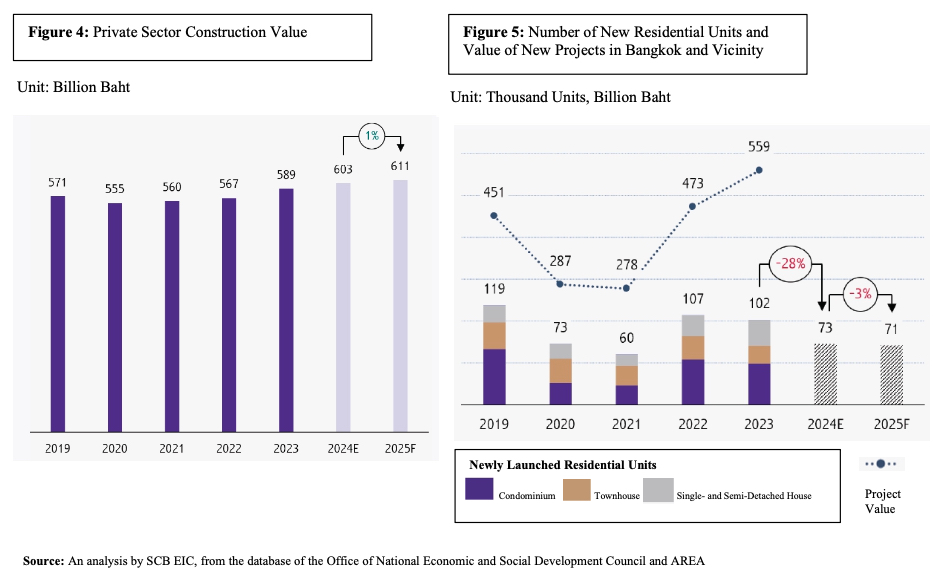 Large-scale commercial construction projects are still being continuously executed, whereby real estate developers have expanded to retail spaces and large-scale mixed-use projects in business and tourism districts, as well as A-grade office building rental, resulting in a potential expansion of office rental supply of approximately 1 million square meters in 2024, reaching 19.1 million square meters. Also, when considering the launch of new projects, SCB EIC is of the opinion that retail space and office rental supply should continue to increase at the average of 0-2% and 2-4% per year from 2025-2027. This is a supporting factor in generating revenue from private sector construction activities in the medium term. However, the oversupply of office rental still has to be monitored, as it may lead to termination of low-potential projects, which can be a risk to the private sector construction in the future.