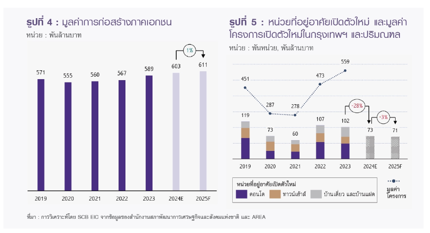 ในส่วนของการก่อสร้างโครงการอสังหาริมทรัพย์เชิงพาณิชย์ขนาดใหญ่ยังดําเนินไปอย่าง ต่อเนื่องโดยผู้ประกอบการพัฒนาอสังหาริมทรัพย์ขยายโครงการพื้นที่ค้าปลีก และโครงการมิกช์ยูสขนาดใหญ่ในทําเลย่าน ธุรกิจ และย่านท่องเที่ยว รวมถึงพื้นที่สํานักงานให้เช่าเกรด A ส่งผลให้อุปทานพื้นที่ค้าปลีกและอุปทานพื้นที่สํานักงานให้ เช่ายังมีแนวโน้มขยายตัวเพิ่มขึ้นอีกราว 1 ล้านตารางเมตรในปี 2024 แตะระดับ 19.1 ล้านตารางเมตร อีกทั้ง เมื่อพิจารณา แผนการเปิดโครงการของผู้ประกอบการ SCB EIC ประเมินว่า ในปี 2025-2027 อุปทานพื้นที่ค้าปลีกและอุปทานพื้นที่ สํานักงานให้เช่ายังมีแนวโน้มขยายตัวอย่างต่อเนื่องโดยเฉลี่ยที่ 0-2% และ 2-4% ต่อปี ตามลําดับ เป็นปัจจัยหนุนให้เกิดเม็ด เงินจากกิจกรรมการก่อสร้างภาคเอกชนอย่างต่อเนื่องในระยะปานกลาง อย่างไรก็ตาม ยังต้องจับตาภาวะ Oversupply ของ อุปทานพื้นที่สํานักงานให้เช่า ที่อาจส่งผลให้เกิดการยกเลิกโครงการที่ไม่มีศักยภาพออกไป ซึ่งนับเป็นความเสี่ยงต่อการ ก่อสร้างภาคเอกชนในระยะข้างหน้า