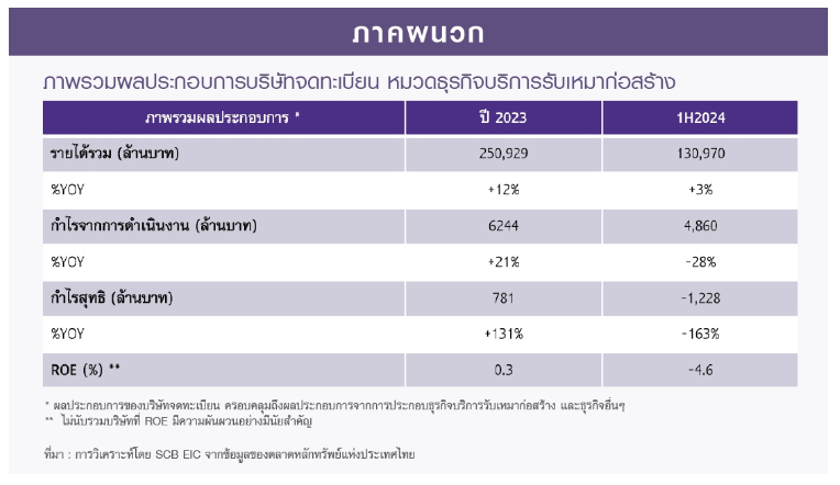 ทั้งนี้แม้ราคาวัสดุก่อสร้างสําคัญ เช่น เหล็ก ปูนซีเมนต์ จะมีแนวโน้มปรับตัวลดลงในปี 2024 และลดลงอย่างต่อเนื่องในระยะปานกลาง แต่ราคาก็ยังมีแนวโน้มอยู่ในระดับสูงเมื่อเทียบกับในอดีต อีกทั้ง ยังมีความผัน ผวนจากปัจจัยต่าง ๆ เช่น ราคาพลังงาน อัตราแลกเปลี่ยน ประกอบกับต้นทุนแรงงานยังมีแนวโน้มปรับตัวสูงขึ้นไปตามการ ปรับขึ้นค่าแรงขั้นตํ่าในระยะข้างหน้า ส่งผลให้ผู้รับเหมาก่อสร้างกลุ่มที่มีแนวโน้มเผชิญความเสี่ยงสูง จะเป็นกลุ่มที่มุ่งเน้น การใช้กลยุทธ์การเข้าประมูลงานโครงการก่อสร้างแบบแข่งขันด้านราคา ที่อาจเผชิญภาวะขาดทุนจากการดําเนินโครงการ ก่อสร้าง ขณะที่ผู้รับเหมาก่อสร้างกลุ่มที่มีความสามารถในการควบคุมต้นทุน ด้วยการบริหารจัดการทําสัญญาสั่งซื้อวัสดุ ก่อสร้างล่วงหน้าได้อย่างสอดคล้องกับความต้องการใช้ และมีการนําเทคโนโลยีก่อสร้างมาใช้ทดแทนแรงงานพื้นฐานได้จะ เป็นกลุ่มที่ยังสามารถรักษาอัตรากําไรไว้ได้
